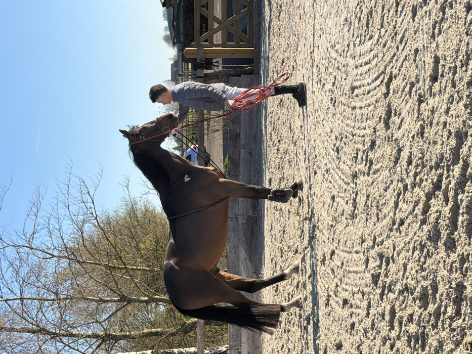 The image displays an outdoor equestrian arena situated in Enghien, Belgium, under a clear blue sky. A young male individual stands to the right of a dark bay horse, both positioned on a light-colored sandy surface exhibiting patterns indicative of grooming. The male wears a light grey puffer jacket, white riding breeches, dark socks, and dark low-cut shoes. He holds a coiled red rope in his left hand, with his right hand gently touching or near the horse's muzzle and bridle. The horse, facing left, is fitted with a dark leather bridle and a system of straps around its body, possibly a training aid. Its front right leg is protected by a dark boot, and its hind legs show white markings. In the midground, a wooden fence serves as a boundary, behind which leafless deciduous trees are visible. A light-colored vehicle is partially discernible through the trees and fence on the left side of the frame. Further right, a wooden gate and distant green foliage are present. A faint contrail is visible in the upper sky.