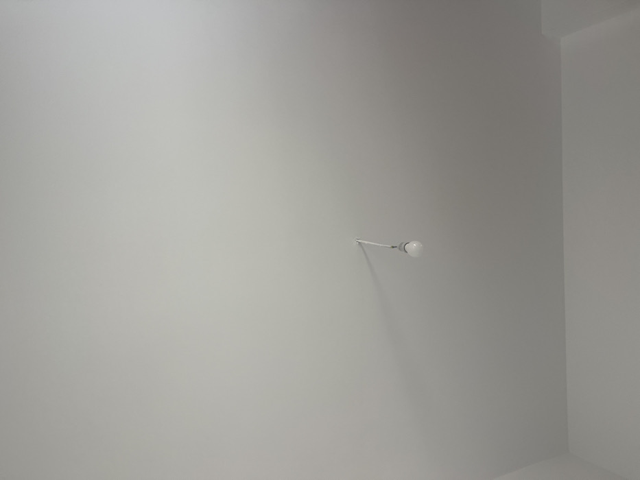 The image displays an interior scene focusing on a light-colored ceiling and upper portions of two adjacent walls. A single white light bulb, approximately spherical with a standard base, is illuminated and suspended by a white electrical cord. The cord is secured to the ceiling by a small, light-colored fixture, and extends downwards towards the bulb. A subtle shadow cast by the bulb's suspension hardware or the bulb itself is visible on the ceiling, extending diagonally to the upper left from the attachment point. The walls and ceiling appear uniformly painted in a light, neutral tone, possibly white or off-white. No other objects, subjects, or actions are discernible. The specific location within the city of Budva, Montenegro, cannot be determined from the visual evidence presented in the image.