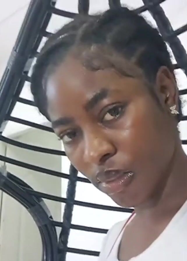 A medium shot shows a Black woman with dark, glossy lip gloss, small silver earrings, and her hair styled in braids and twists, sitting in a black, woven hanging chair