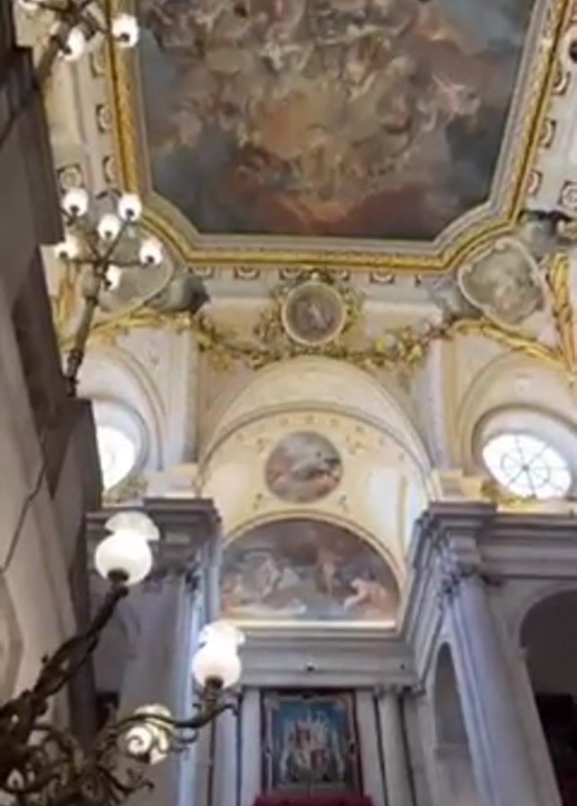 The camera, initially pointed at an ornate ceiling painting, tilts down to reveal a grand staircase inside a stately building