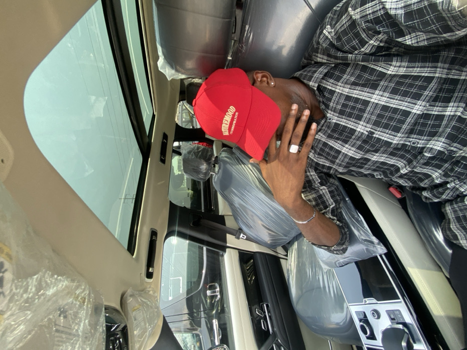 This image depicts a male individual seated in the front passenger seat of a modern, luxury sport utility vehicle located in Igboefon, Nigeria