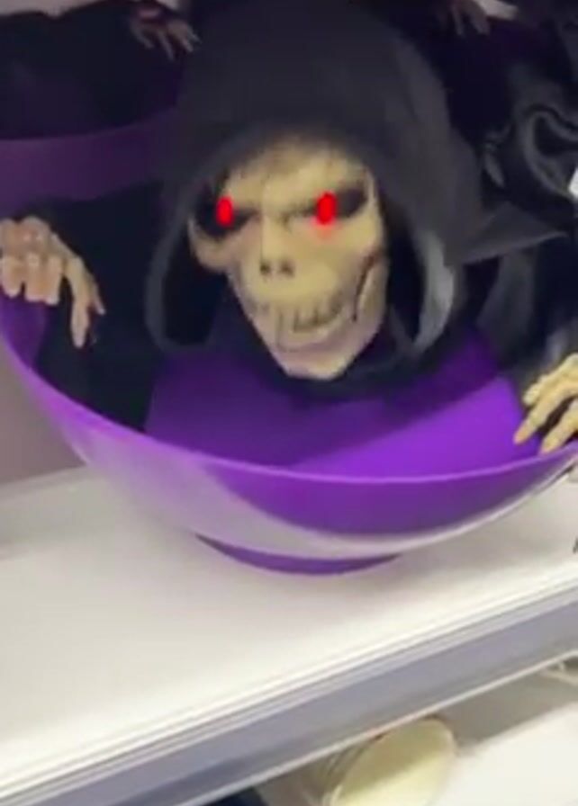Halloween decoration on a shelf, consisting of a skeletal figure with glowing red eyes dressed in a black hooded robe, sitting inside a purple and white striped candy bowl