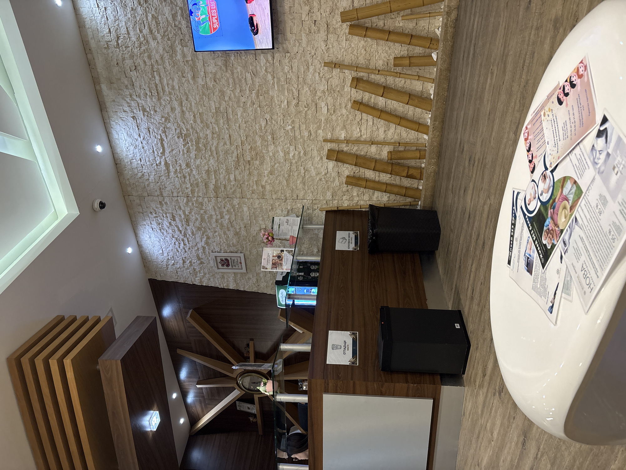 The image depicts the interior of a commercial establishment, possibly a spa or wellness center, located in Pavel Banya, Bulgaria. The scene includes a reception desk made of wood with informational posters on it. Behind the desk, a wall with an artificial brick pattern and bamboo sticks for decoration. A television screen showing an advertisement for "SUPLES Ltd." is mounted on the wall. To the left is a modern wood slat ceiling. A round white table with brochures is located near the front of the frame. The overall environment appears clean and modern.