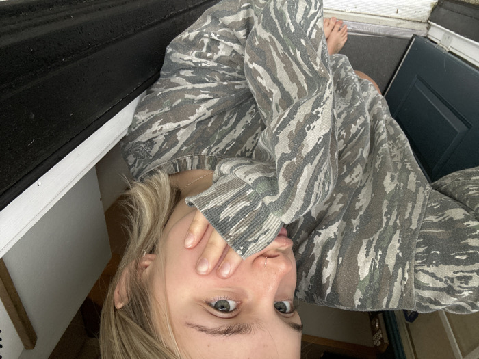 A person with blonde hair is captured in a rotated selfie, wearing a camouflage print sweatshirt and pants