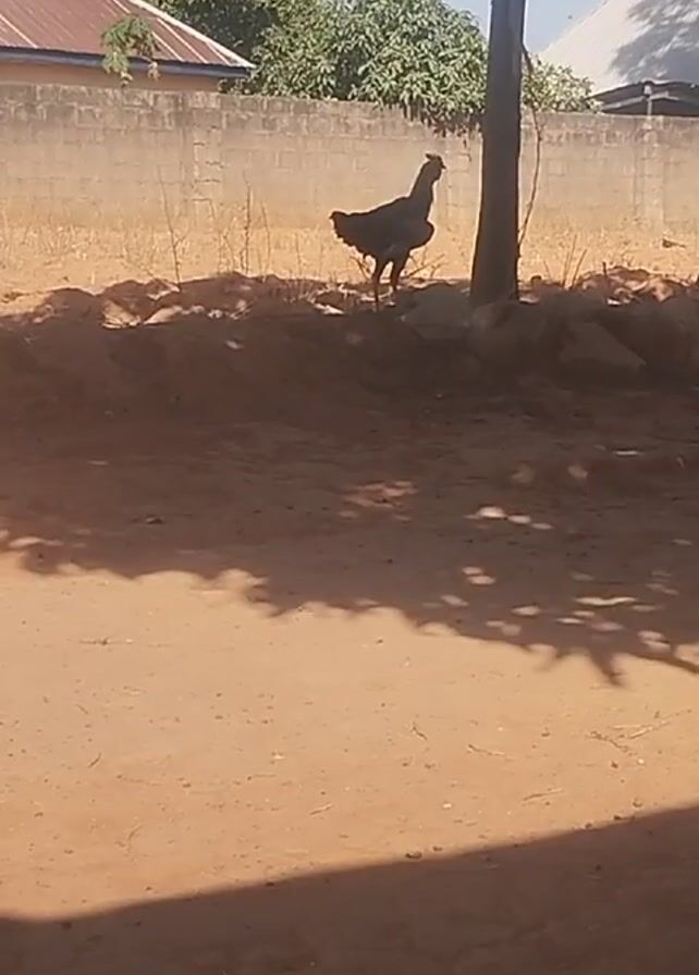 black chicken standing on a sandy patch of ground with a low wall in the background. There is a tree trunk to the chicken's right. The ground in the foreground is also sandy, and there is some shade cast on it, presumably from the tree. Beyond the wall are some trees and rooftops of buildings. The sky is visible at the top of the frame and appears clear. The chicken remains still for most of the video. There is a crowing sound at the beginning of the video, likely from the chicken.