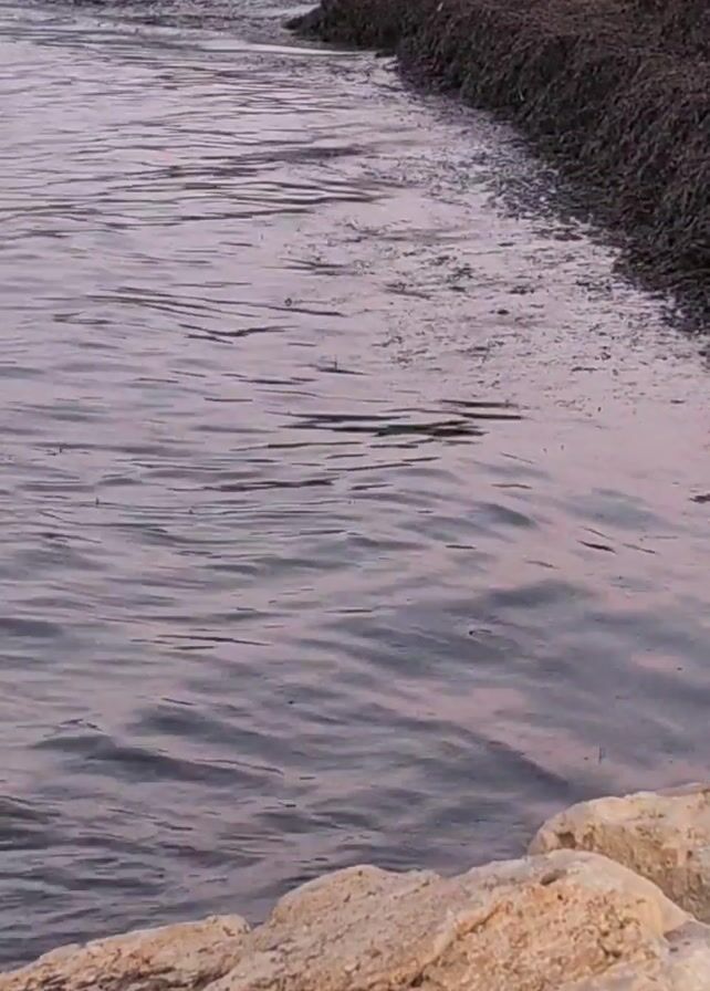 body of water with small waves, viewed from a low angle behind a light-colored rocky outcrop. The shoreline to the right is covered in what appears to be seaweed or dense vegetation. The water is a muted grey-purple color. The sky is not visible, but its reflection suggests it may be near sunset or sunrise.