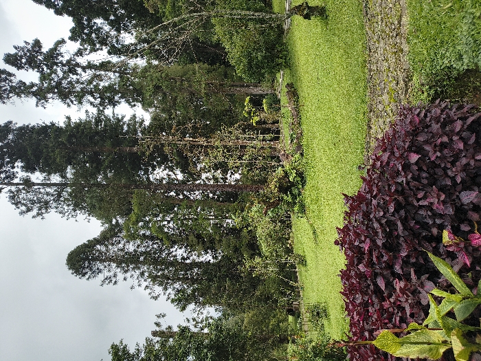 A lush green landscape features tall, slender trees reaching towards a cloudy sky. A well-maintained lawn slopes gently, bordered by a moss-covered stone wall on one side. A vibrant display of purple foliage dominates the foreground, contrasting with the verdant lawn. The scene captures a peaceful, cultivated natural setting.