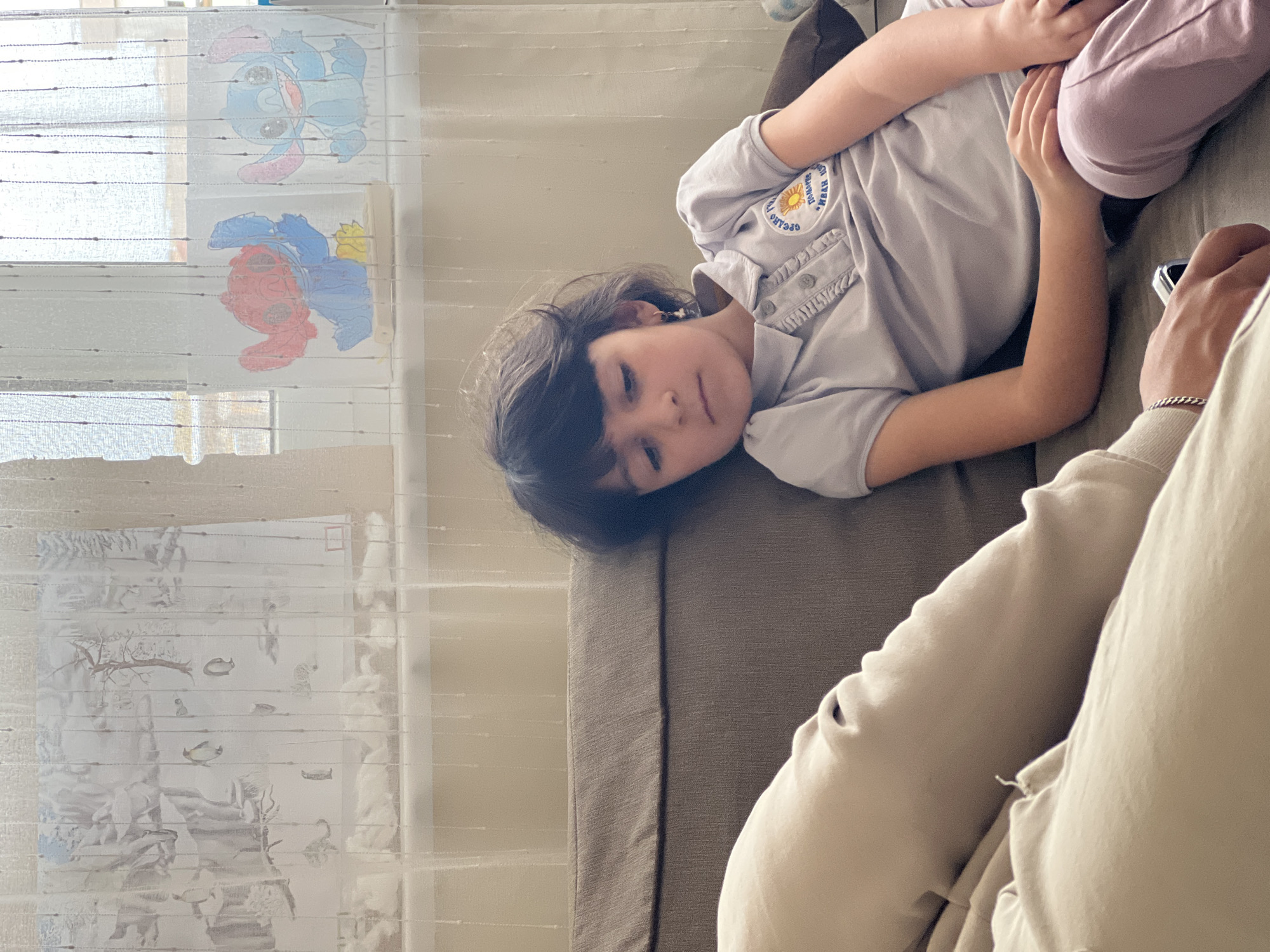 An indoor scene depicts two individuals seated on a brown upholstered sofa in what appears to be a residence in Pomorie, Bulgaria. In the foreground, the lower torso and legs of an individual wearing light-colored pants are visible. Their left hand, adorned with a silver chain bracelet, rests on their lap next to a small dark object. To the right, a young girl with dark hair, estimated to be between 6 and 10 years old, is seated on the sofa. She wears a light grey short-sleeved polo shirt with ruffles on the placket and a circular patch on the left chest. The patch displays a yellow sun and Cyrillic text, clearly indicating "ПОМОРЕ" (Pomorie) and "ИВАН НОВ" (Ivan Nov), identifying a local school or organization within Pomorie, Bulgaria. She also wears light purple pants and a small light-colored earring on her right earlobe. Her head is tilted, and her gaze is directed downwards and slightly to her right. The background features a window covered by sheer, light-colored curtains with vertical decorative strands. Taped or positioned behind the curtains are two distinct sets of artwork: a larger drawing of a winter landscape with penguins on the left, and two smaller drawings of the character "Stitch" (one predominantly red and blue, the other light blue) on the right. The lighting is diffused, suggesting natural light from the window.
