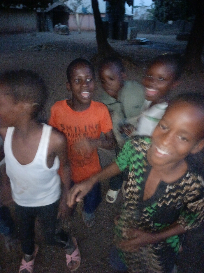 The image depicts five children outdoors in a dimly lit, unpaved area within Akwanga, Nigeria