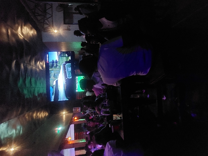 A dimly lit room shows a large screen displaying a scene with a car, viewed by a crowd. The wall is adorned with shimmering, reflective patterns, possibly lights creating effects. People are seated, suggesting a viewing event, such as a sports game. The overall atmosphere is dark, with only the screen and subtle lighting providing illumination.