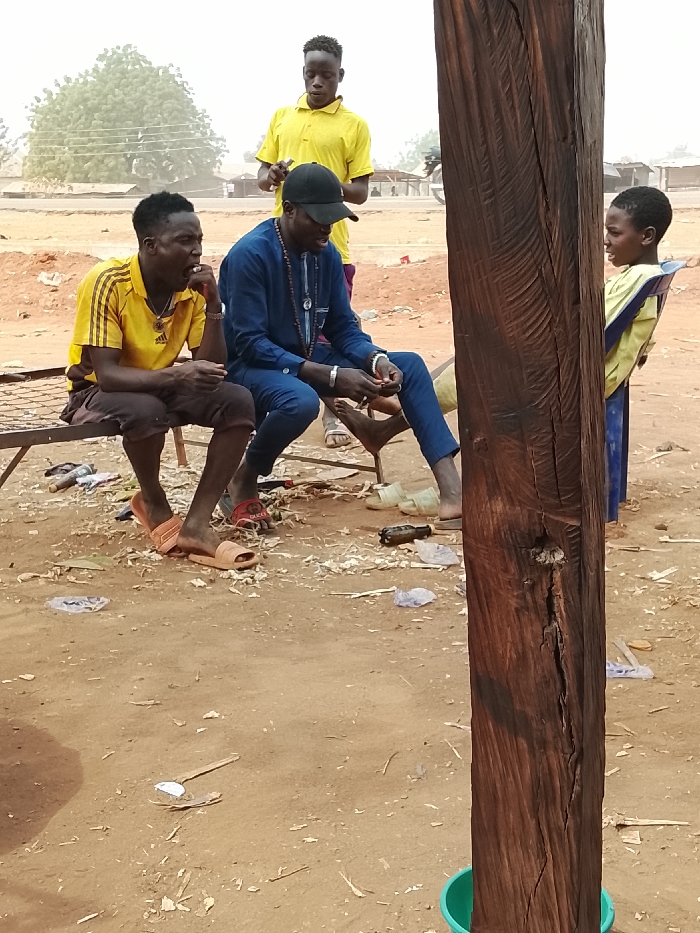 An outdoor scene in Katcha, Nigeria, depicts four males in a dusty, unpaved area