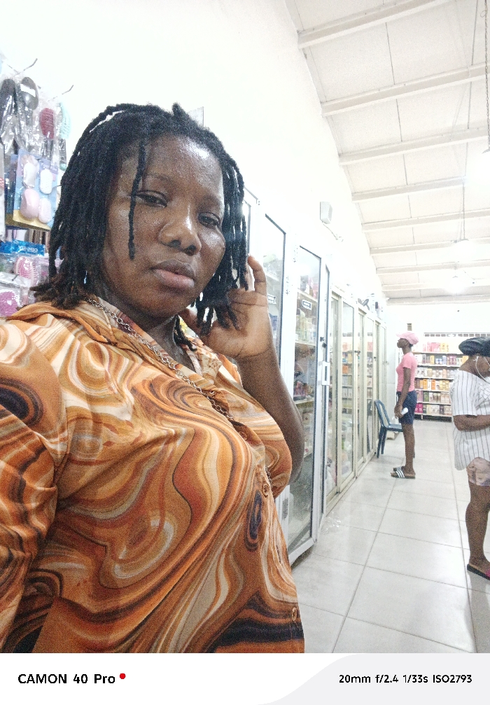 A woman with dreadlocks and an orange, swirling-patterned blouse poses for a selfie inside a brightly lit store