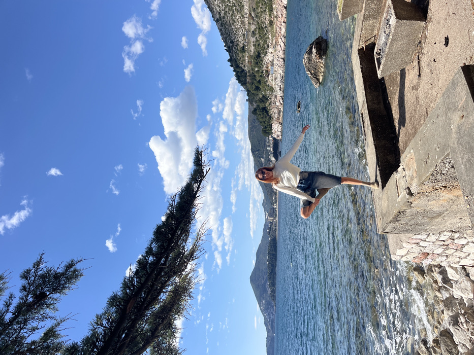 The image captures a coastal scene in Kamenovo, Montenegro, under a bright blue sky with scattered white cumulus clouds. A single female subject stands on a multi-level concrete platform in the foreground, performing a one-legged yoga pose (Tree Pose), balancing on her left leg with her right foot placed against her inner left thigh. Her arms are extended outwards for stability. She has reddish-brown hair, wears sunglasses, a cream-colored long-sleeved top, blue denim shorts, and light-colored flat shoes. The concrete platform features a stone-faced retaining wall section near the water and three empty, rectangular concrete planters on its upper level to the right. The immediate shoreline consists of rocks and pebbles, leading into the clear, blue-green sea. A large dark rock is visible in the water towards the mid-right. In the background, across the water, two landmasses are visible: a large, vegetated hill with buildings lining its base to the left, and a smaller, rocky, sparsely vegetated hill to the right. A dark green coniferous tree branch extends into the upper left quadrant of the frame.