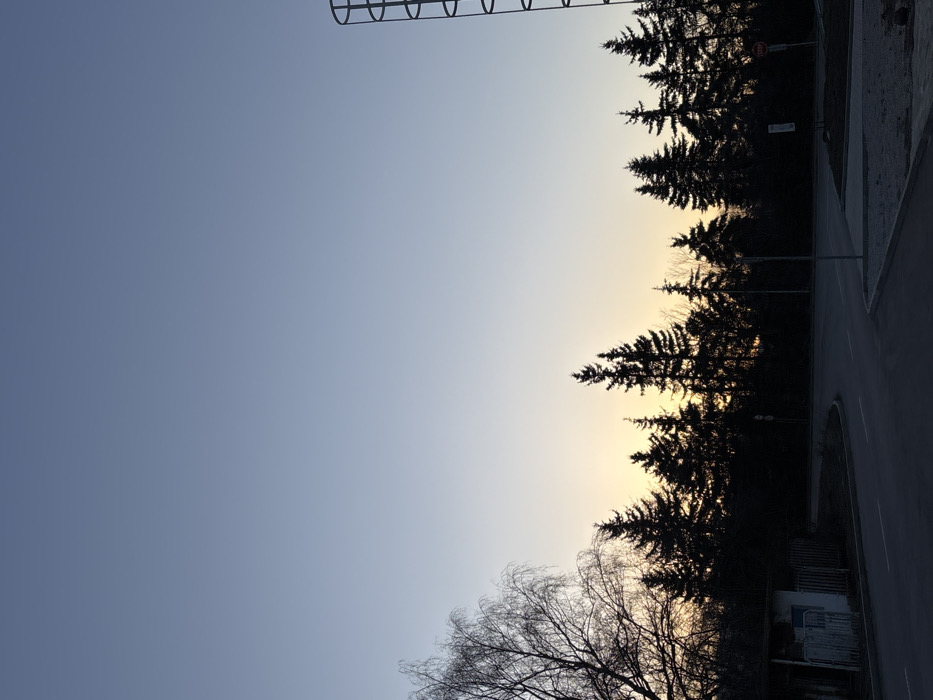 The image depicts an outdoor urban or semi-urban scene in Elin Pelin, Bulgaria, captured during either sunrise or sunset. The sky, occupying the upper two-thirds of the frame, transitions from a pale blue overhead to a warm yellow-orange glow along the horizon. A dense line of dark coniferous trees forms a prominent silhouette against this illuminated horizon, obscuring the direct source of light. To the far left, a leafless deciduous tree with fine branches is also silhouetted against the sky. In the lower left quadrant, a small, light-colored, single-story building, possibly a utility structure or bus stop shelter, with a dark roof and a fence, is partially visible. The foreground features a dark asphalt road or intersection, curving slightly to the right, with visible lane markings. A concrete curb defines the edge of the road on the right. Further into the midground on the right, a red octagonal "STOP" sign is mounted on a pole beside the road. In the far right periphery, a section of a tall, vertical metal structure with horizontal rungs, possibly a ladder system on a tower, is visible extending upwards. No individuals or vehicles are present.