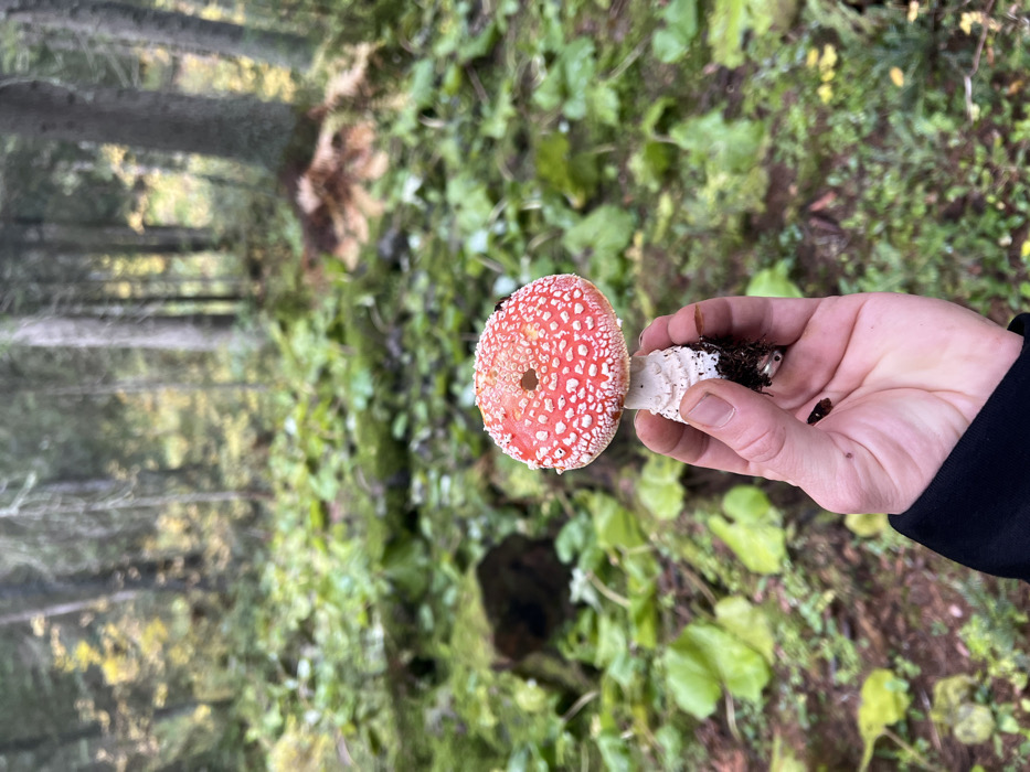 - "A human left hand, with pale skin and clean, short fingernails, holds a single *Amanita muscaria* mushroom upright in the foreground of a forest scene" by FM-CjoWV2, licensed under CC BY 4.0