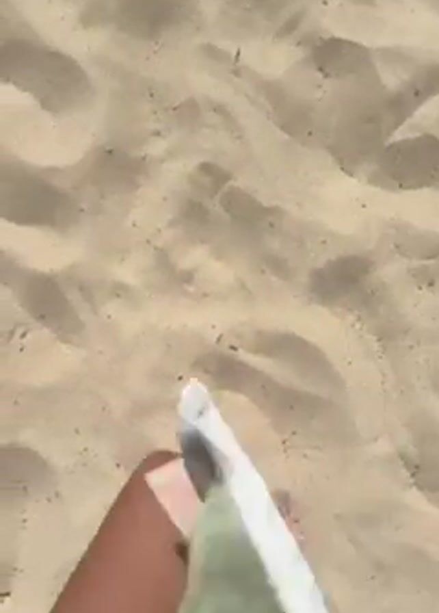 From a first-person perspective, the video shows a person walking barefoot across a sandy beach