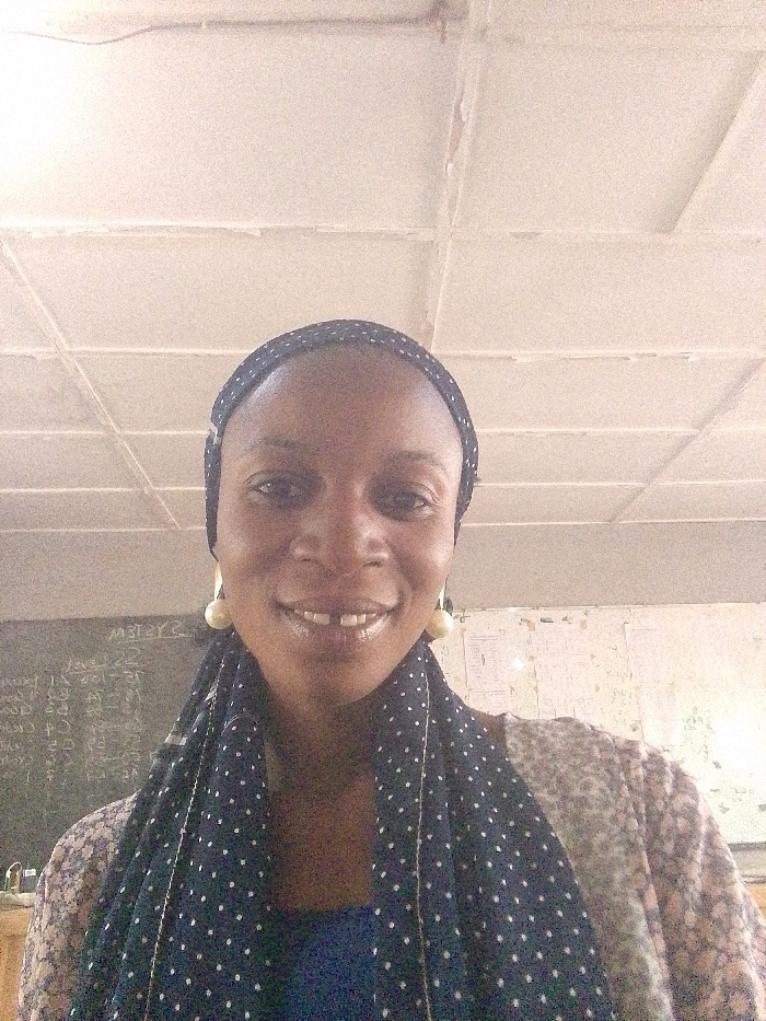 An adult female is depicted in a medium close-up, facing the viewer and smiling. She has a dark complexion, a gap between her two upper front teeth, and is wearing large, light-colored circular earrings. Her head is partially covered by a dark blue headscarf or headband with small white polka dots, matching a similarly patterned scarf draped around her neck and over her shoulders. She wears a dark blue garment underneath what appears to be a light-colored, patterned outer layer, possibly a floral print. The background indicates an indoor environment, likely an educational or administrative setting within the city of Barnawa, Nigeria. To the subject's left, a dark chalkboard or whiteboard with white writing, including the word "SYSTEM" and numerical entries, is partially visible. To her right, a light-colored wall features multiple sheets of paper or charts, some appearing aged and curled, affixed to the surface. Above the subject, a white suspended ceiling is visible, displaying some discoloration and apparent damage to the tiles and exposed linear elements, possibly structural supports or conduits. The lighting is even, suggesting overhead illumination.