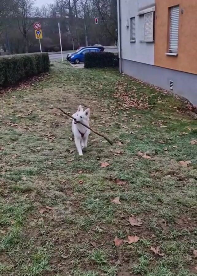 - "small, white puppy carrying a large stick in its mouth across a grassy, leaf-strewn area next to a building and a road" by FM-73bW32, licensed under CC BY 4.0