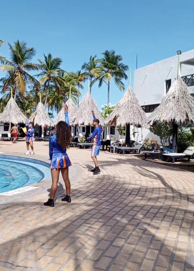 three people dressed in blue and orange costumes by a swimming pool. The first shot shows two performers raising their arms in the air, while the third person is standing in the background by the pool. The second shot shows a performer in front of a fountain and another pool, with palm trees in the background. The third shot shows an arm and hand gesturing in front of the same pool, with a fountain in the middle. The final shot shows the original two performers raising their arms by the pool again, with thatched-roof structures in the background. The scene is set on a sunny day at a tropical resort.