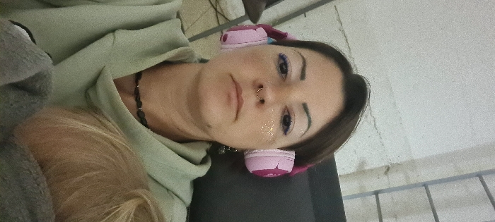 An adult female and a child are depicted in an interior setting, likely within the city of Nahariyya, Israel. The adult female, positioned centrally and looking directly at the camera, has brown hair and wears a light green hooded sweatshirt and a dark, beaded necklace. She has pink over-ear headphones on. Her face features white eyeshadow, purple lower eyeliner, and gold glitter applied to her right cheek. She has a gold septum piercing and dark, dangling earrings on her left ear. Partially visible in the lower right quadrant is the back of a child's head with blonde hair, resting against the adult and covered by a gray blanket or garment. The background consists of a light-colored wall with visible cracking, and a partial view of a metallic, ladder-like structure or shelving unit is discernible on the right side of the frame. The scene suggests a stationary moment within an indoor environment.