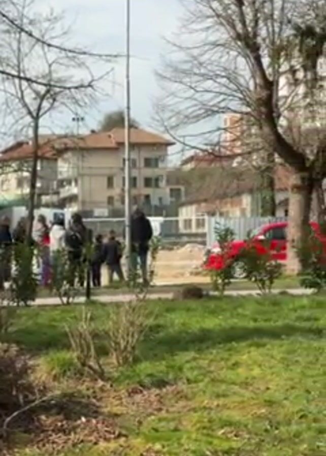 group of people gathered near a construction site in what appears to be a park or public space. A police car is parked nearby, and a red truck drives past. A group of people in green uniforms and white head coverings can be seen walking on the sidewalk next to the construction site. The scene is filmed from a distance, with trees and bushes in the foreground. There is sound in the video; possibly music from wind instruments or a trumpet. The weather seems mild, with a mix of sunshine and clouds.