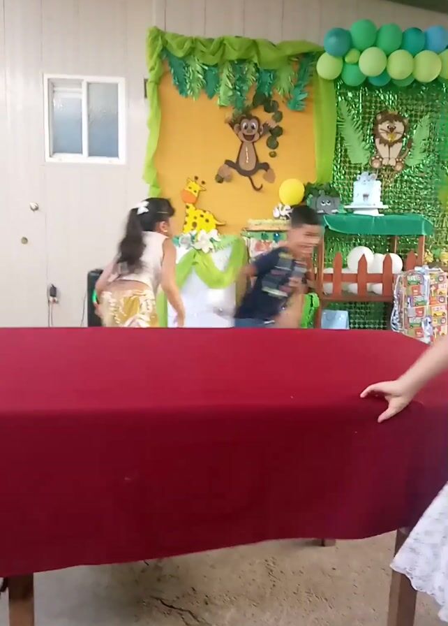 The scene takes place in a party setting with a jungle theme. A red tablecloth covers a large table in the foreground. Behind it, a backdrop is decorated with green leaves, balloons, and images of jungle animals like monkeys, giraffes, and lions. To the left, a black speaker with a colored light display is visible. Two children, a boy and a girl, are playing in front of the backdrop. They are holding hands and playfully pushing each other. Another girl in a white dress briefly runs in front of the camera. The environment suggests an outdoor or semi-outdoor space with a corrugated metal roof visible above. The atmosphere appears festive and celebratory.