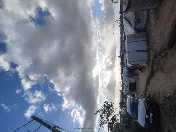 - "The image displays an outdoor scene in Khan Yunis, Palestinian Territory, under a sky with prominent grey and white cumulus clouds, allowing beams of sunlight to penetrate from the upper left" by FM-SMnrI3, licensed under CC BY 4.0