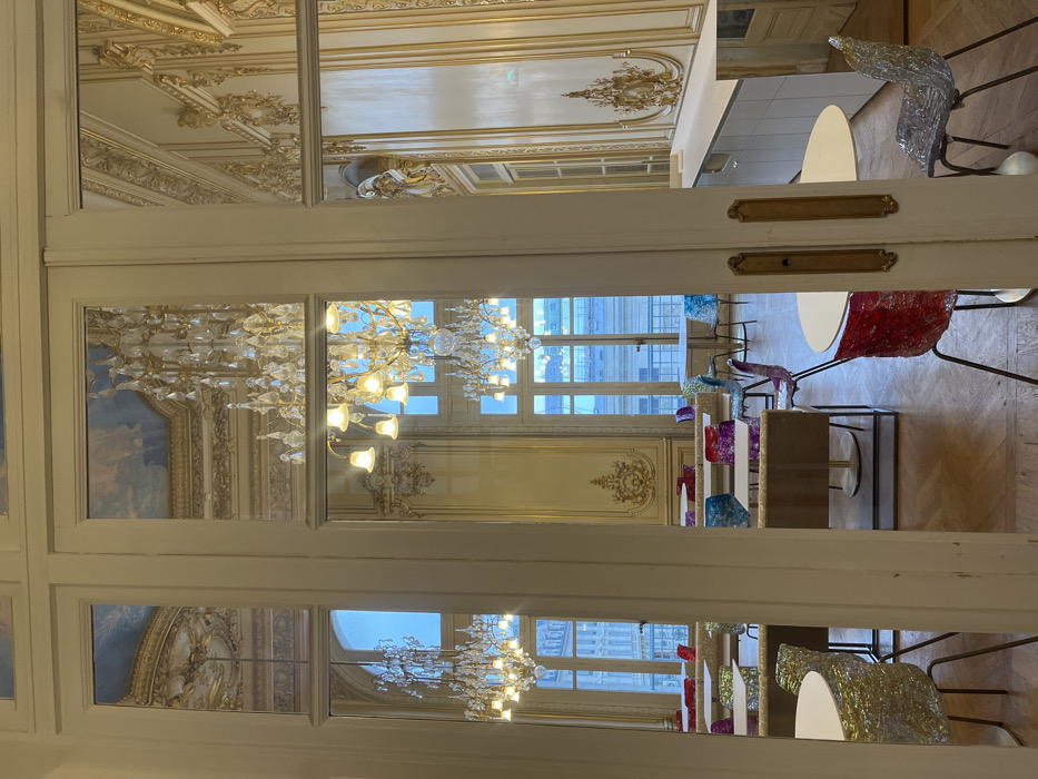 The image depicts a view through ornate, white-framed doorways into a room. The room features elegant, old-world architectural details like gold-leafed trim, murals, and crystal chandeliers reflected in the doorway glass. Modern elements are introduced with rows of vibrant, textured chairs and white, round tables, creating a juxtaposition of classic and contemporary design. Natural light streams through the tall windows, illuminating the parquet flooring.