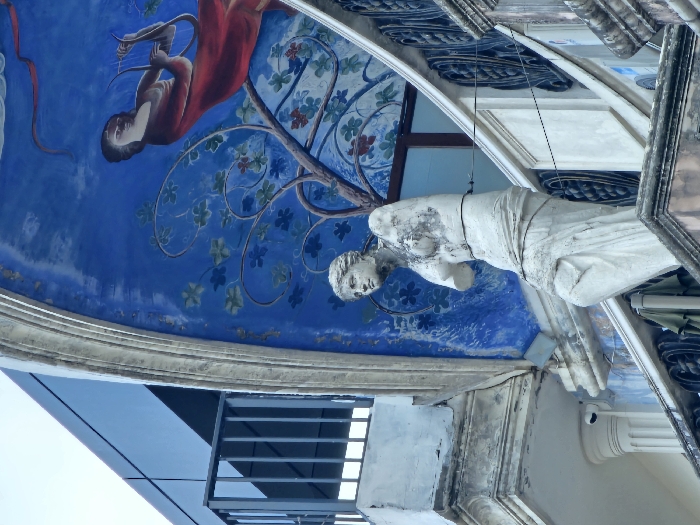 The image displays an upper architectural section of a building located in Piazza Square, Batumi, Georgia, observed under natural daylight. A weathered, armless white classical-style female statue stands prominently on a decorative stone balcony ledge in the foreground. The statue's head is intact, facing slightly left and upward, while its torso lacks both arms below the shoulders. White drapery covers the lower half of the figure. Several thin dark wires or cables are horizontally secured around the statue's waist area. Directly behind and above the statue, a vibrant blue mural is painted on a curved architectural soffit. This mural features a stylized brown tree with green and dark red foliage. To the right side of the mural, a female figure in a long red gown is depicted playing a golden lyre. A red, ribbon-like element extends from the left side of this painted figure. To the left of the statue, a section of an aged white building facade with decorative molding is visible, including a white dome-shaped security camera mounted near a classical-style column base. Above this, a contrasting modern architectural element, characterized by dark glass panels and a black metal railing, is present. Behind the statue and below the mural, a brown-framed window is partially discernible. Below the balcony ledge, a folded dark green umbrella is visible on the left, and a white air conditioning unit is partially visible on the far right, mounted below an ornate balustrade.