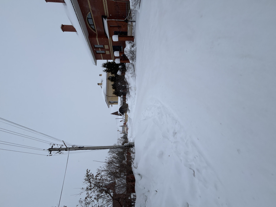 A snowy street scene depicts snow-covered ground with footprints leading towards a row of houses on the left. The houses are of various architectural styles, including a red brick building with a chimney. Power lines extend from a utility pole in the lower-left corner of the frame. The sky is overcast, suggesting a recent or ongoing snowfall. Trees with bare branches stand near the road, adding a stark contrast to the blanket of white.