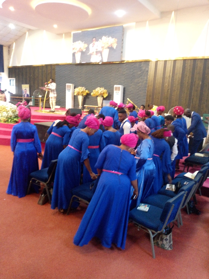 An indoor gathering is depicted within a large assembly hall or church in the city of Television, Nigeria