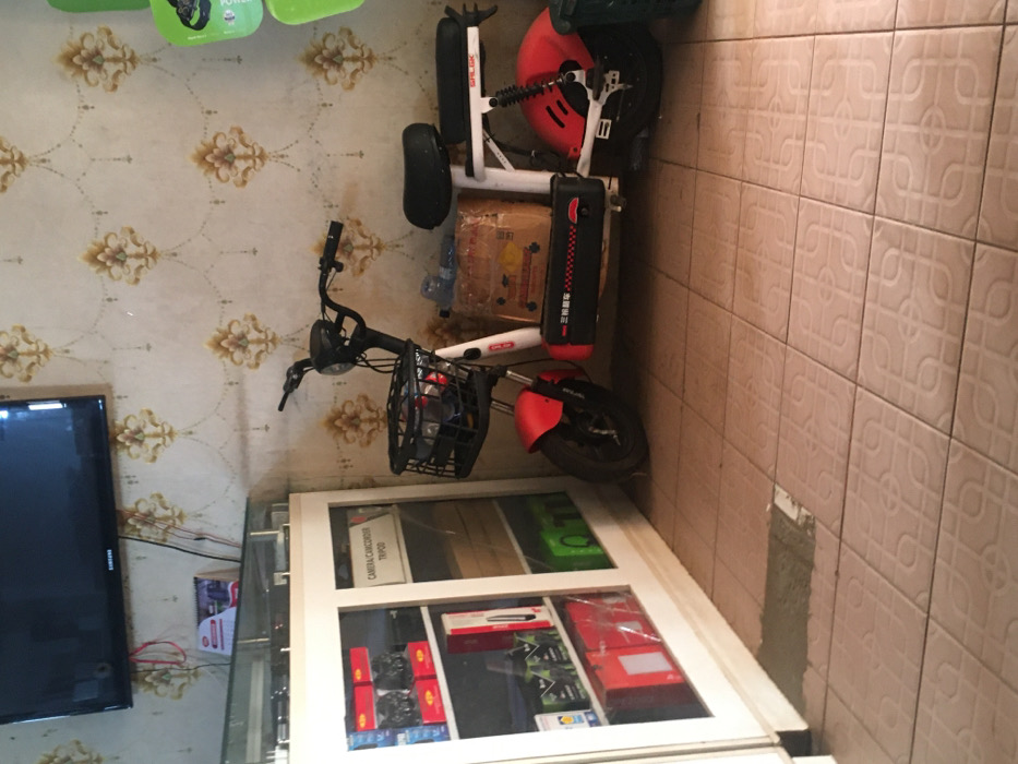 The image depicts an interior room in Shaba, Nigeria. A white, two-door display cabinet with glass front panels stands against the left wall. The cabinet's shelves hold various boxed items, some in red packaging, and a visible sign labels a section as "CAMERA/CAMCORDER TRIPOD." A black Samsung flat-screen television is wall-mounted above the cabinet, with red electrical wiring extending downwards. The wall is covered with light-colored wallpaper featuring a repeating pattern of golden, ornate motifs. On the tiled floor, a white and red electric scooter is parked. Its front basket contains several plastic water bottles and other assorted objects. A large brown cardboard box is positioned on the scooter's footboard area. The scooter is branded with "SHILEK" on the rear fender and displays Chinese characters "三州锂电" on a side panel. The floor consists of light brown square tiles with a geometric pattern. A patch of darker, possibly damp, material is visible on the floor adjacent to the base of the display cabinet. No individuals are present in the scene.