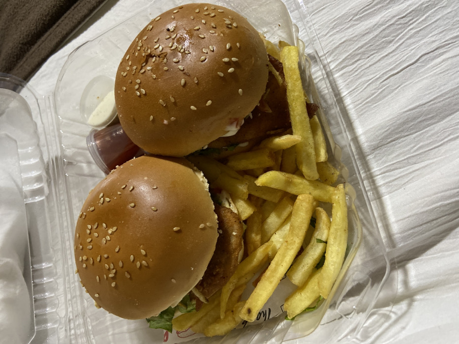 - "Two sesame seed buns sit atop burgers with lettuce, sauces, and fried patties inside" by FM-49R4h1, licensed under CC BY 4.0