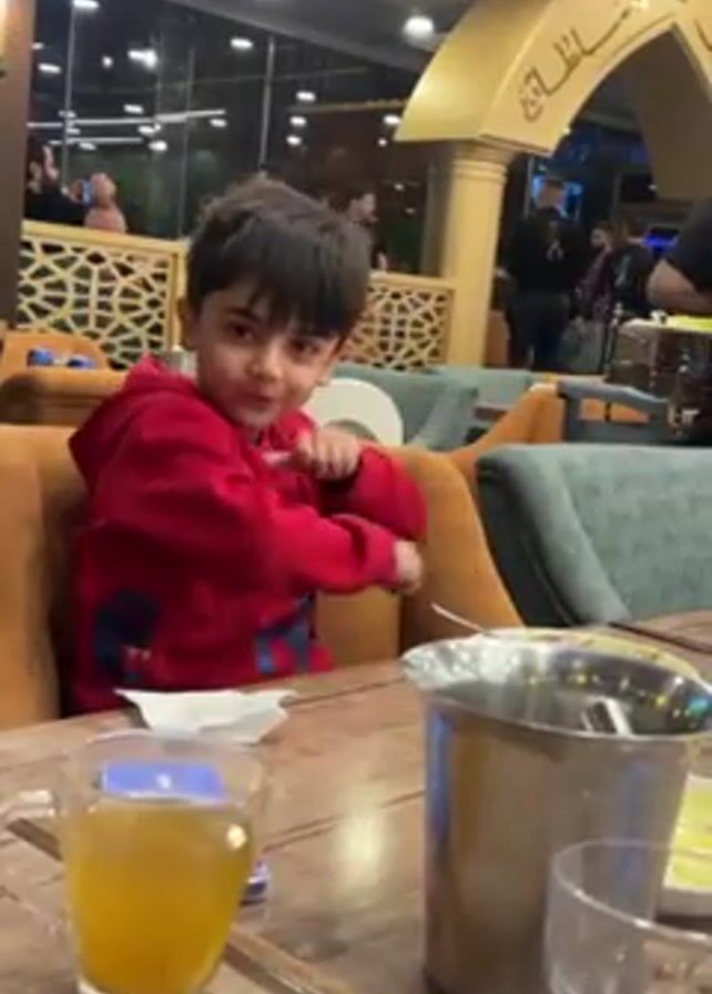A young boy wearing a red sweatshirt with a Spider-Man design is sitting at a wooden table in what appears to be a restaurant. He is looking at the camera and making rapid twisting motions with his fists. There is a glass of orange liquid, a stainless steel ice bucket, and a small plate on the table in front of him. The restaurant has plush brown and teal seating, and the background shows other patrons and staff, with ornate gold architectural details visible. The overall lighting is warm and slightly dim. The boy seems playful and energetic.