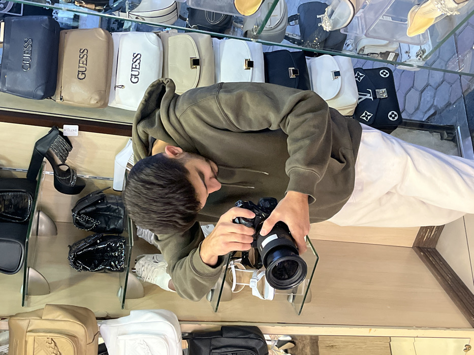 The scene depicts the interior of a retail establishment, likely a women's accessory boutique specializing in handbags and shoes, located in Al-Midan Municipality, Syria. A young adult male, with short dark hair and a trimmed beard, is the central figure, positioned in the left-center of the frame. He is wearing an olive green hooded sweatshirt and light-colored trousers. The male is actively engaged in holding and adjusting a black DSLR or mirrorless camera fitted with a prominent black lens, his gaze directed downwards at the camera. The background is filled with merchandise displayed on multiple clear glass shelves supported by silver brackets, mounted on light-colored wooden or panel walls. To the left of the male, visible items include a light brown backpack-style bag, a white tote bag, two black patent leather or quilted shoulder bags, a pair of white high-heeled sandals, and a pair of white athletic shoes. To the right of the male, a vertical arrangement of "Guess" branded handbags in dark blue, beige, and white are stacked. Below these are several plain light-colored handbags with gold-toned clasps, and a black handbag with white 'LV' style monograms. Additional footwear, including embellished sandals, are visible on lower shelves to the far right. The environment appears well-lit, indicating an active commercial space.