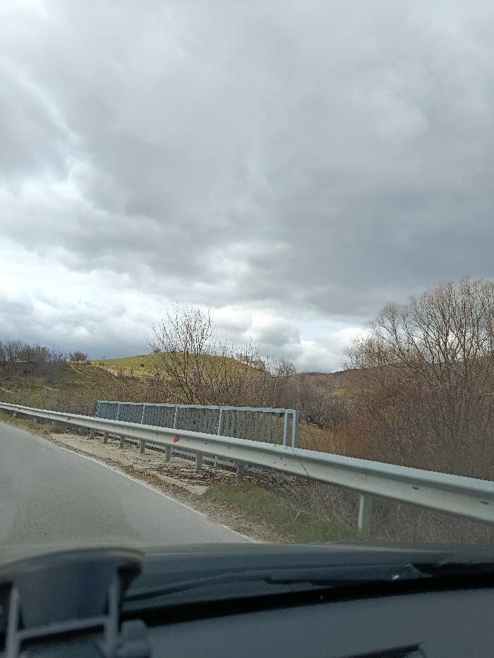 The image depicts a rural road scene in Kamchiya, Bulgaria, captured from the interior of a vehicle. A portion of the vehicle's dark dashboard and a dark accessory mount are visible at the bottom of the frame. The asphalt road surface occupies the lower-left, bordered on its right by a galvanized metal W-beam guardrail equipped with red reflectors. Behind this guardrail, a taller, secondary metal fence with vertical gray slats is visible, suggesting a bridge or embankment structure. To the immediate left of the road, a green, grassy hillside ascends, dotted with scattered bare deciduous trees and shrubs. Further in the middle distance, another distinct green hill is visible, also featuring sparse bare vegetation. To the right of the road and beyond the guardrails, a densely vegetated area characterized by numerous bare deciduous trees and bushes slopes downward. The sky overhead is completely covered by a uniform layer of thick, gray overcast clouds. No individuals or specific actions are discernible.