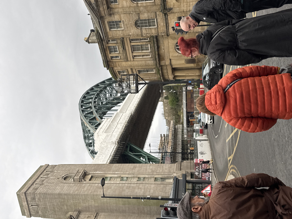 A street scene features the iconic Tyne Bridge in Newcastle upon Tyne, with scaffolding partially obscuring its lower structure