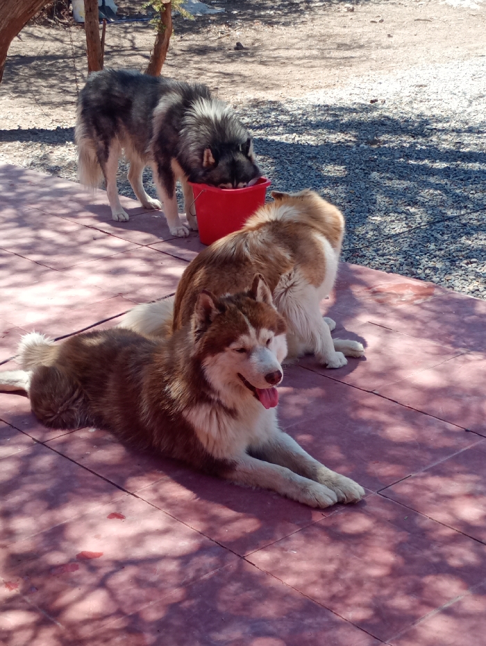 The image depicts three dogs, consistent with Alaskan Malamutes or Siberian Huskies, in an outdoor setting in Pozo Almonte, Chile. In the foreground, a red-brown and white dog is lying on a reddish-brown tiled surface, facing right, with its tongue slightly extended. Behind and to the right of this dog, a light brown and white dog is partially visible, appearing to be resting on the same tiled surface. In the background, to the left, a grey and white dog stands with its head submerged in a red cylindrical bucket, presumably drinking or eating. The ground transitions from the tiled surface to a light-colored gravel or dirt area in the background. Sparse tree trunks and branches are visible in the far background. Sunlight casts dappled shadows of foliage across the tiled ground.