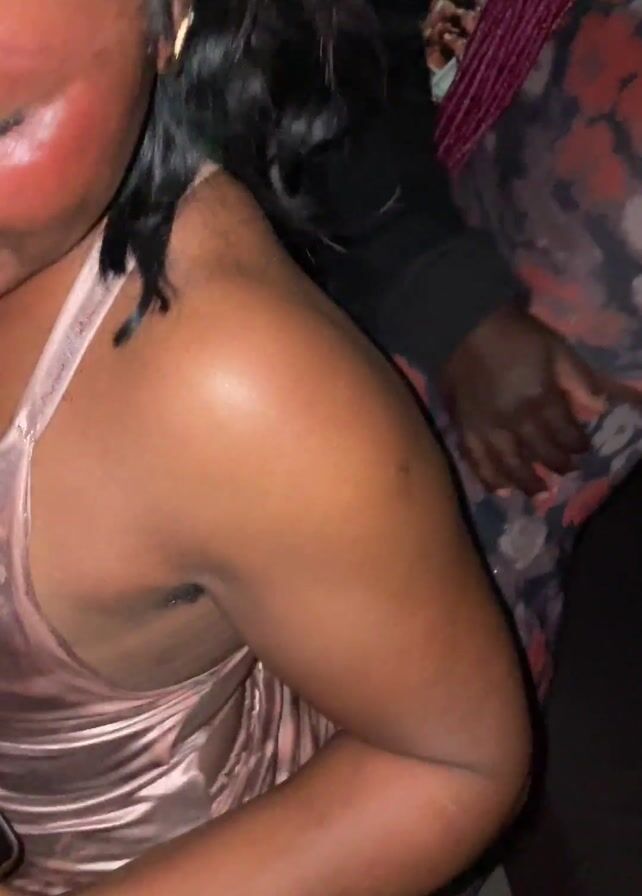 three people, likely women, dancing closely together in a dark setting. The person in the foreground is wearing a shiny rose-gold dress with a backless design and thin straps. To their right is a person wearing a dark floral print dress, holding a blue bottle. To the left, another person is wearing a light-colored paisley patterned top. The camera angle is low and close, capturing the movement of the people as they dance. The environment is dimly lit, but the focus is on the people and their dancing.