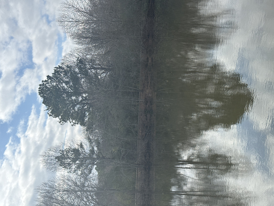 A tranquil scene features a body of water mirroring the sky and trees. The sky is partly cloudy with patches of blue. Tall trees, some bare and others evergreen, line the water's edge. Their reflections create a blurred and distorted image in the water, blending the boundary between the trees and their mirrored counterparts. A sense of stillness and quiet permeates the image.