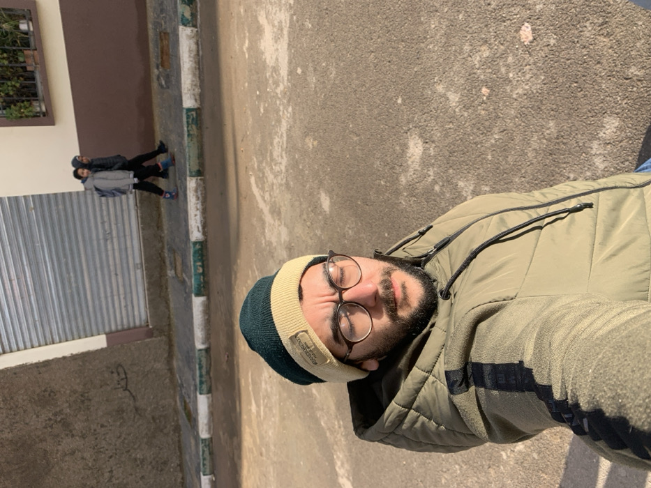 The image captures an outdoor urban street scene in Ouislane, Morocco, under bright daylight conditions. The perspective is a close-up selfie, focusing on a male individual in the foreground. This individual, estimated to be in his late 20s or early 30s, has a dark beard and wears round, dark-rimmed glasses. He is dressed in a dark green and beige knit beanie with a visible label and an olive green quilted puffer vest worn over a similarly colored long-sleeved garment featuring a vertical black stripe on the sleeve. His eyes are closed, suggesting he is squinting due to the strong sunlight originating from the right of the frame. The ground directly in front of and around the subject is rough, light-colored asphalt. A sidewalk runs horizontally across the midground, featuring a curb painted with alternating green and white sections. On this sidewalk, two younger individuals, likely children or teenagers, walk from left to right. The first individual, closer to the camera, wears a light grey hooded jacket, a light backpack, and multi-colored blue and pink footwear. The second individual, further back, wears a dark hooded jacket and dark pants. The background consists of two adjacent buildings. The structure on the left has a rough-textured, light brown concrete wall with some faint dark Arabic graffiti and a closed, grey corrugated metal rolling shutter. The building to its right features a two-toned facade with a dark brown lower section and a lighter upper section, containing a window secured by dark metal bars, with potted plants visible behind the bars.