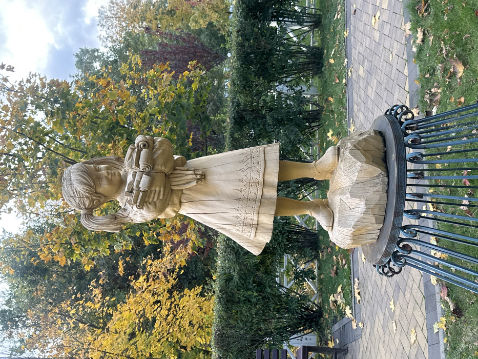 In a park in Irpin, Ukraine, a light-toned wooden statue of a young girl is prominently positioned