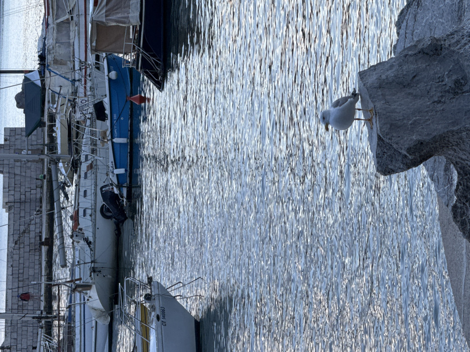 The image depicts a harbor scene in Herceg Novi, Montenegro. In the immediate foreground, a single adult seagull with white plumage, grey wings, and yellow legs stands atop a large, grey, angular rock. The midground features a body of rippling water, reflecting ambient light. Numerous vessels are moored in the water, including several white sailboats. One sailboat's bow is visible on the left, displaying the registration "CT 140863." A blue motorboat, identified by "Fisher" and "PORTUN 590" on its hull, is equipped with an outboard engine. A spherical red buoy floats in the water near the blue boat. In the background, a multi-tiered grey stone wall, possibly a pier or fortification, with visible steps, lines the far side of the harbor. A solitary individual, wearing a red top and dark trousers, stands or walks on top of this stone wall, facing right. Additional boats and parts of structures are discernible in the distance.