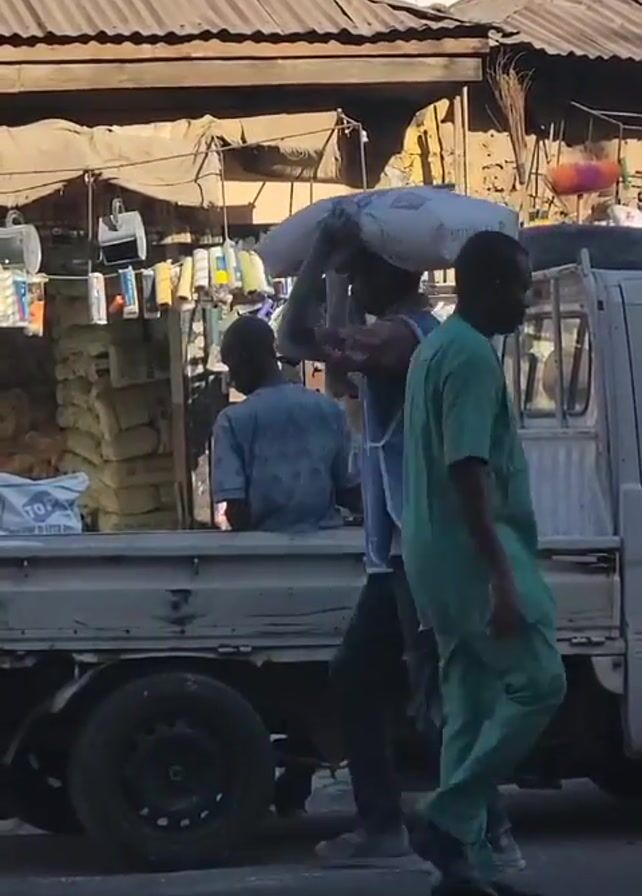 A man in a blue vest carries a large, gray, labeled bag on his head. He is walking on the street, next to a small truck piled with goods, including paint buckets, bags, and various other items. Another man in a green shirt is standing next to the truck, appearing to assist or observe. The environment appears to be a busy outdoor market or commercial area, with buildings and stalls in the background. The scene seems to capture the daily activities of commerce and manual labor.