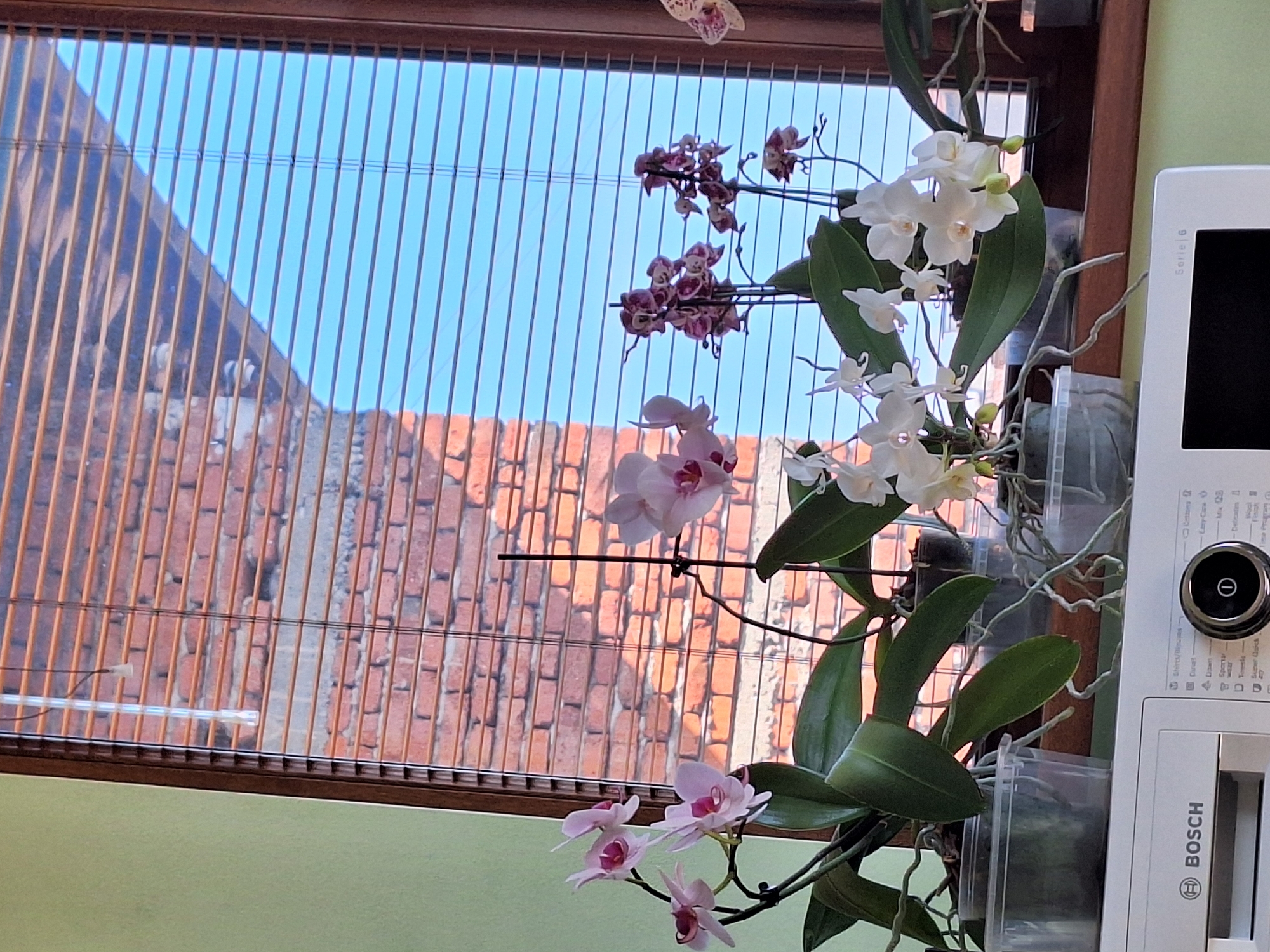 A photograph taken indoors depicts a view through a window, likely in Montana, Bulgaria, based on the presence of terracotta roof tiles visible in the background. The window is partially covered by vertical blinds. In the foreground, a blooming orchid plant with white and light purple flowers is positioned on a windowsill. To the right of the plant, part of a white Bosch Serie 6 appliance is visible, suggesting a domestic setting. The interior wall is painted a light green. The scene is lit with natural light, indicating daytime.
