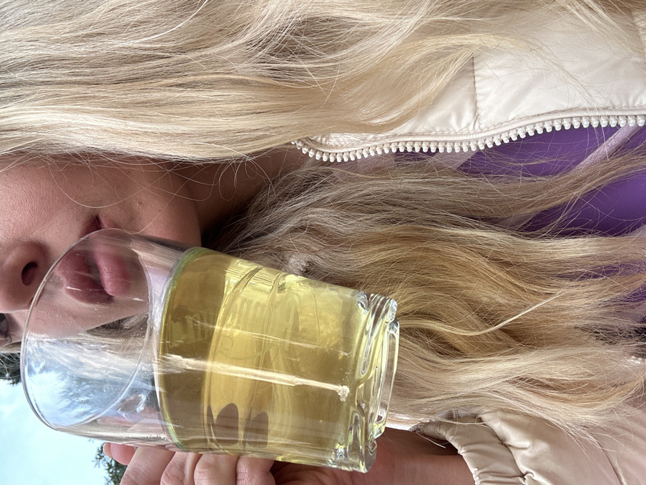 A close-up image depicts a person, likely female, drinking from a clear glass containing a translucent, yellowish-green liquid. The glass is held by the left hand, with partial fingers visible, and positioned to the mouth, obscuring the upper lip and nose. The lower lip is visible and appears pink. The individual has long, wavy, blonde hair and wears a light beige or cream-colored quilted jacket with a prominent white zipper, over a vibrant purple garment. The background is out of focus, showing a blue sky and blurred green foliage, indicating an outdoor setting. The scene is located in Budva, Montenegro; however, specific landmarks or a precise location within the city are not discernible from the image.