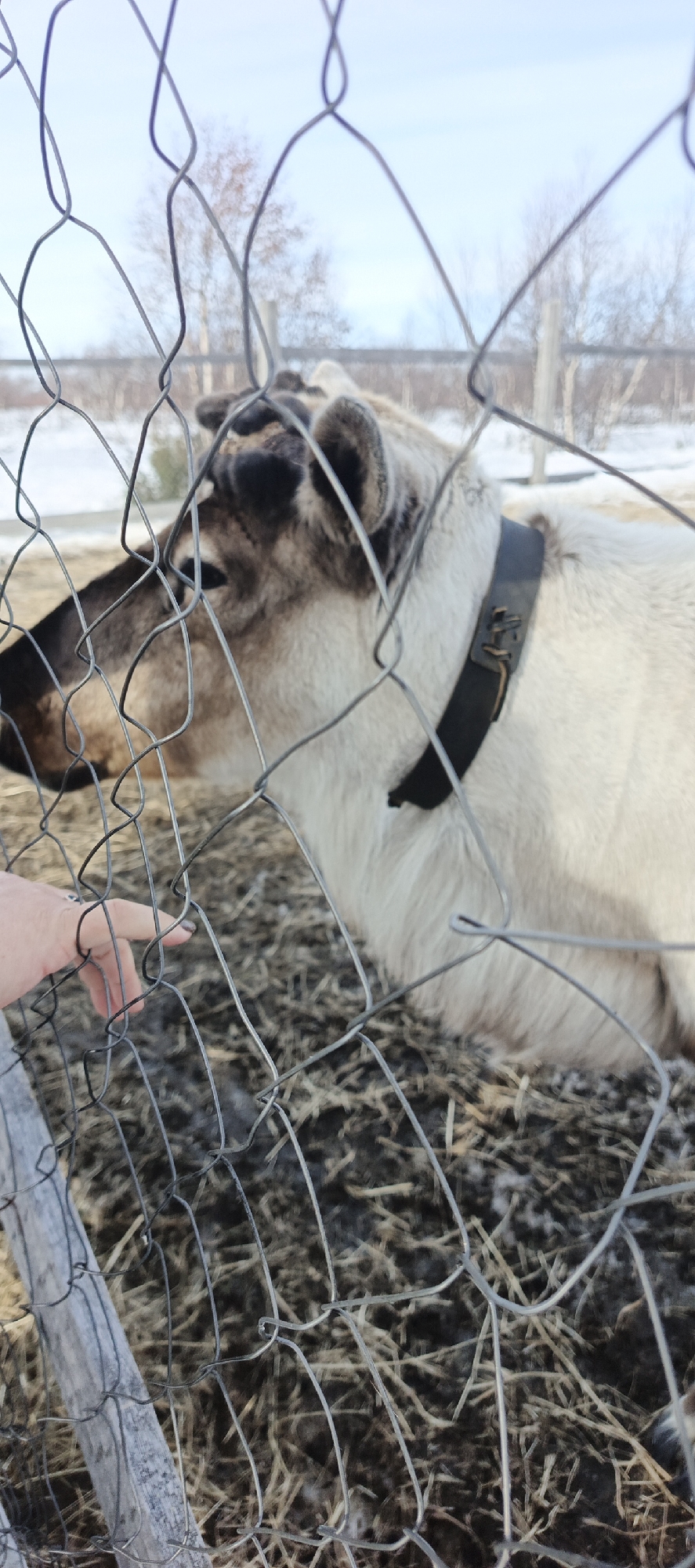 In Naryan-Mar, Russia, a reindeer with a dark collar stands behind a wire fence. A person's finger touches the fence, reaching towards the reindeer. The ground is covered in straw. Bare trees are visible in the background against a pale sky. Snow is visible on the ground behind the trees.