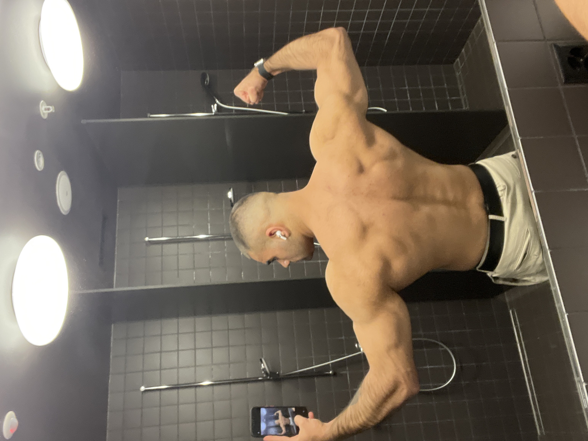 The image depicts a male individual taking a mirror selfie in a shower or changing room area of a fitness center. Based on contextual information, this location is identified as the Ochsner Sport fitness center at Gundeldingerstrasse 49, Basel, Switzerland. The subject is a muscular male, shirtless, facing away from the viewer and towards a mirror, flexing his back and left arm. His left arm is bent at the elbow with a clenched fist, showcasing his bicep and shoulder musculature. He wears light-colored (possibly beige or off-white) pants secured with a black belt. White wireless earbuds are visible in both ears, and a dark-colored smartwatch is on his left wrist. His hair is short with a fade, and he has light stubble. He holds a black smartphone in his right hand, positioned to capture his reflection in the mirror, which is visible on the phone screen. The environment features walls covered in dark, square tiles. Two silver shower fixtures with flexible hoses and showerheads are visible against the tiled wall. The ceiling is dark and equipped with several circular light fixtures, including a large, bright white disc-shaped light prominently positioned in the upper right quadrant of the image, and a smaller, dimmer circular light fixture to its left. A white fire sprinkler head is also visible on the ceiling. The bottom edge of the mirror reveals a dark, tiled surface below it.