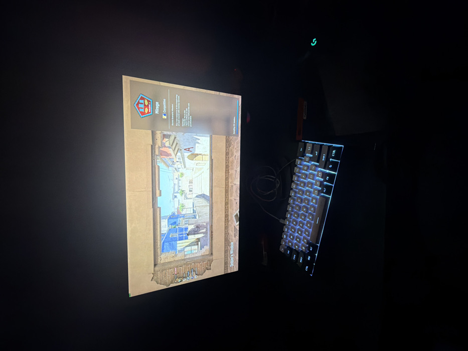 An interior scene in Yambol, Bulgaria, depicts a computer gaming setup in a dimly lit environment