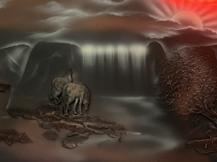 This image depicts a stylized, mixed-media artwork, possibly a relief sculpture or painting with three-dimensional elements, located in Marcoussis, France. The scene portrays a landscape under a vibrant red sky. In the upper right quadrant, a large, intense red sun emits light, partially obscured by dark, gray, cloudy formations that extend across the sky. Prominent dark mountain or rock formations rise in the background, from which a light-streaked waterfall descends on the left. In the mid-ground, a body of water or misty river extends across the scene. Two three-dimensional horse figures stand on a textured, rocky bank in the left-midground; one faces away from the viewer looking towards the right, while the other stands with its head lowered. Both horses exhibit mottled gray and brown textured surfaces. On the right side, a heavily textured, dark reddish-brown, gnarled tree-like structure rises from the bank. The foreground ground is uneven and textured with dark browns and grays, accented with subtle red hues and speckled details, contributing to the overall dark and red-dominated color palette.